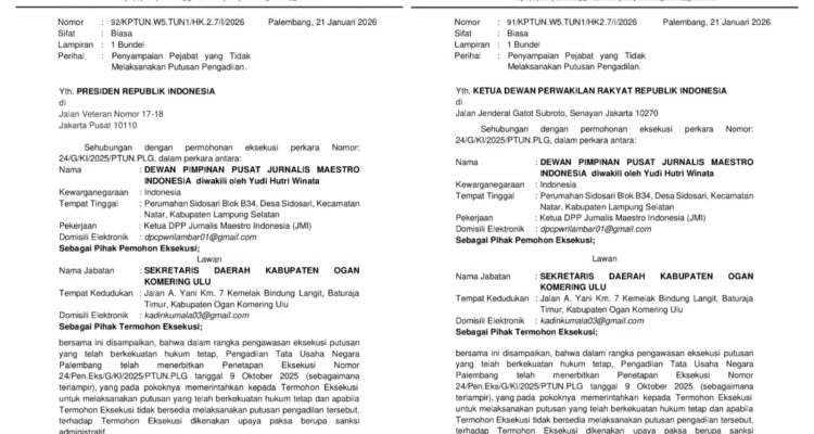 PEMKAB OKU MEMBANGKANG PUTUSAN HUKUM: PTUN PALEMBANG SURATI PRESIDEN DAN DPR RI Daerah, Palembang|Januari 22, 2026oleh Admin KD Palembang,– Kompas1.id || 22 Januari 2026 — Pemerintah Kabupaten Ogan Komering Ulu
